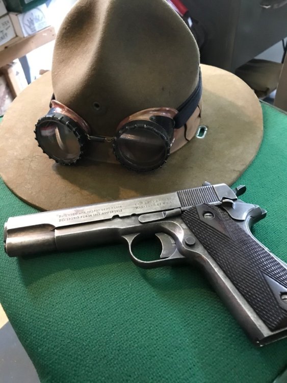 I use my campaign hat with googles if I’m in my Punitive Expedition tunic. Use a 1911 leather drop cavalry holster and web gear pouches on a web belt.