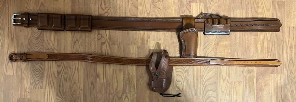 First rig: J.M. Ross belt, holster, mag pouches and ammo slide. Belt measures 46” to center hole sold Second rig: second rig unmarked also 46” to center.sold