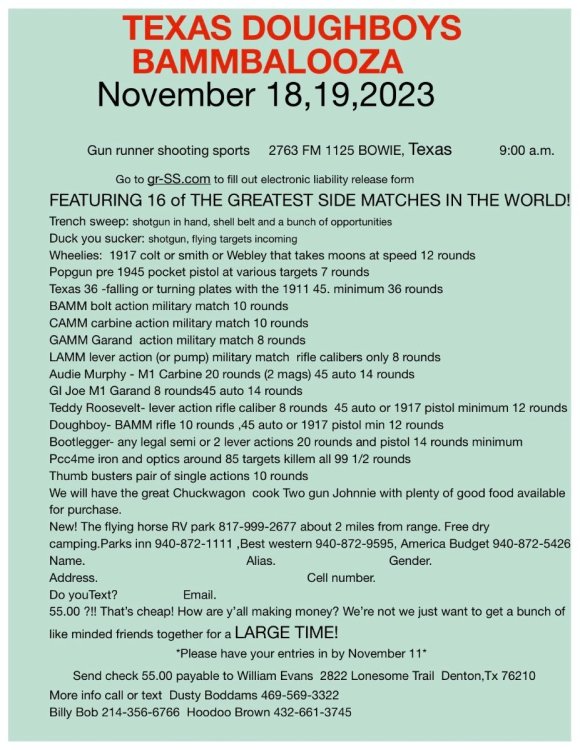Howdy y’all! This is our monthly match. We shoot full blown genuine 100 proof wild bunch! Usually after lunch we will have BAMM . Our matches are held in Bowie,Tx at gunrunner shooting sports. 2763 fm 1125 Bowie,Tx 76230 please text or call Dusty Boddams 469-569-3322 Hoodoo Brown 432-661-3745 Billy Bob 214-356-6766 for any info needed or confirm match. we start our monthlies at 9:00