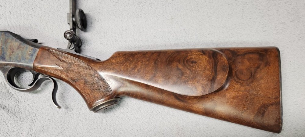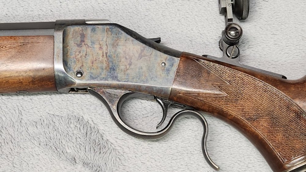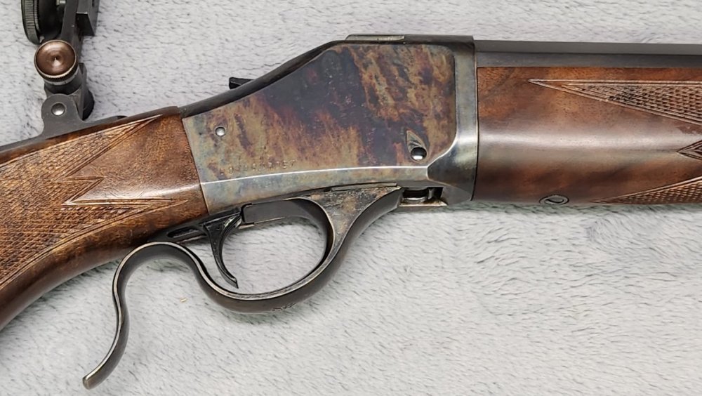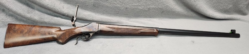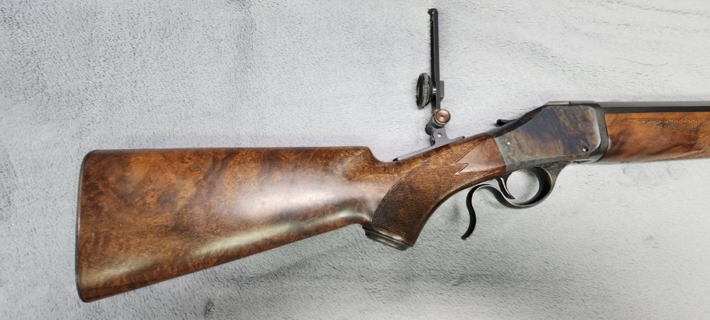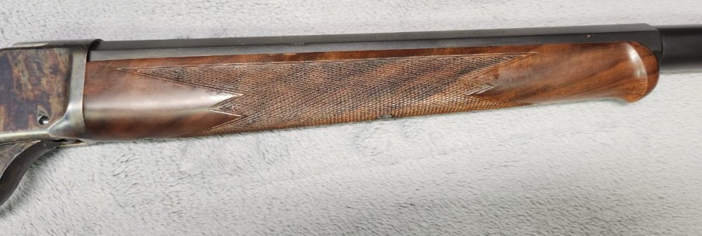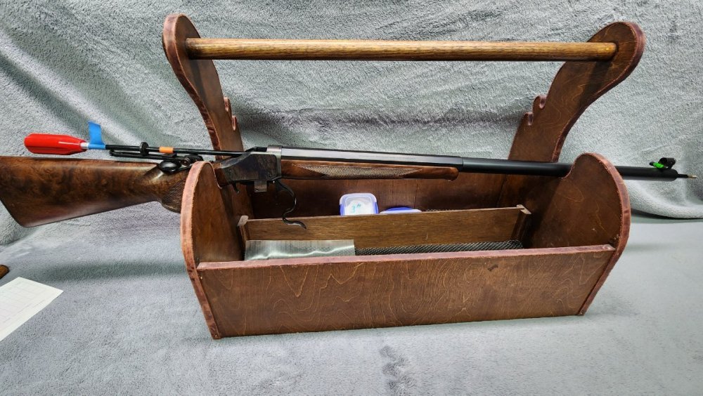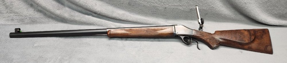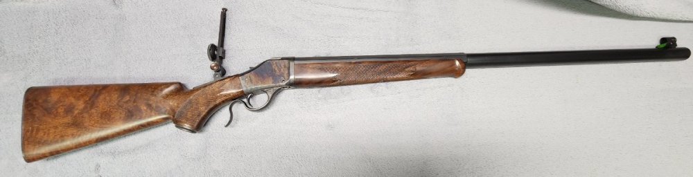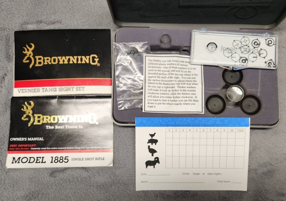 13. Browning Model 1885 BPCR in 40-65, vernier tang sight and bullet mold for asking $2,200. plus shipping. Clean bore. Wear as noted in pictures. Please PM me if your interested with your contact information so I can calculate shipping. Browning vernier tang sight set, upgraded rear sight to Lee Shafer variable aperture sight. One set of front globe sight inserts RCBS Mold Handles and Two Bullet MEI (Meister Bullet) aluminum mold – casts ~406gr w/30:1 alloy with the proper diameter .410” I used it to shoot long range Silhouettes. Road Rash – top of receiver and part of barrel. I was shooting on a concrete shooting bench when the rifle rolled off the carpet on to the bench Ships in a Plano Air Glide rifle case to protect the rifle.