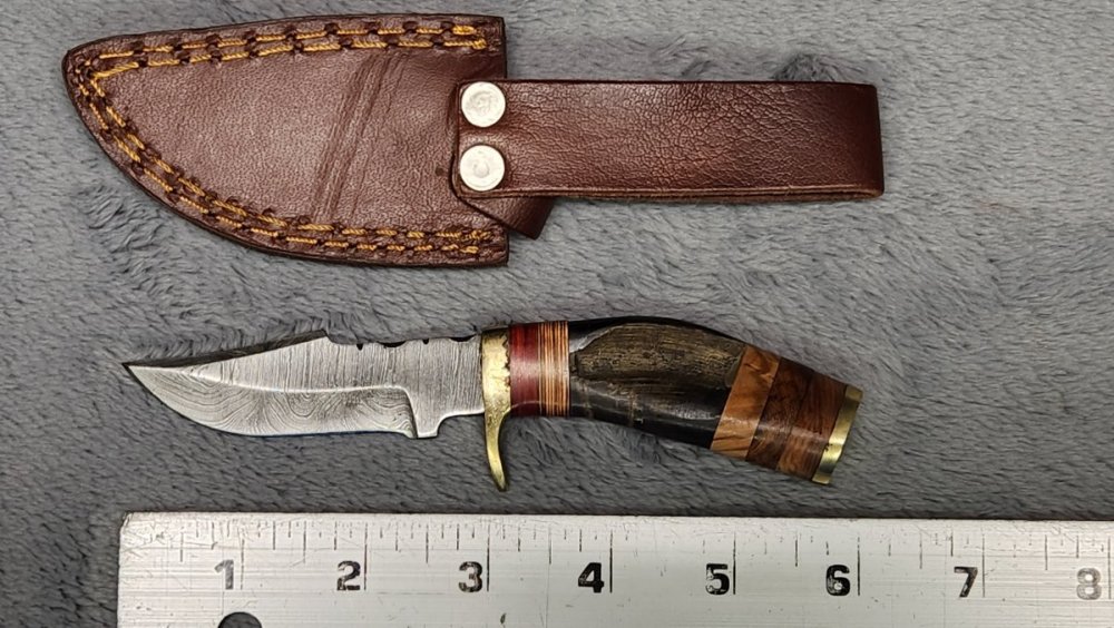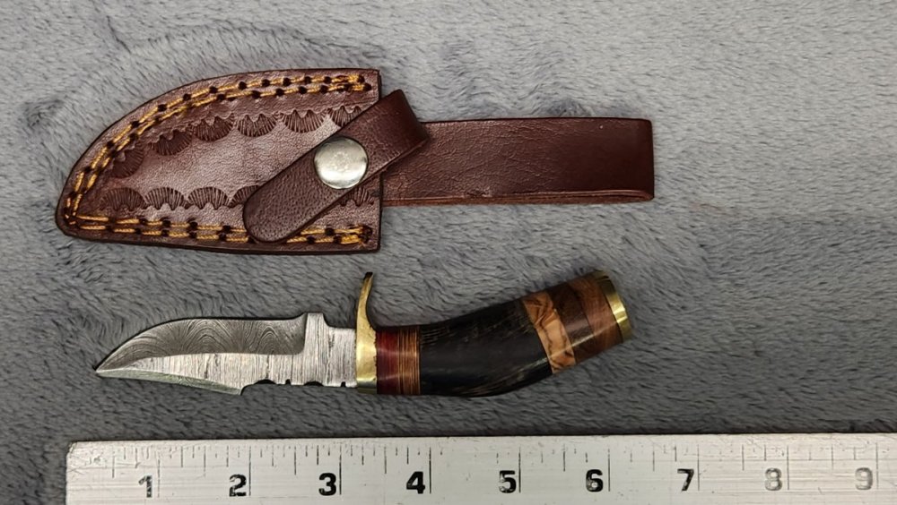 12. Please PM me if you’re interested. Overall full tang is 6” steel, the BLADE is 3”. It comes with a LEATHER sheath. Price $40.00 shipped. No trades - US Postal Money Order or cash.